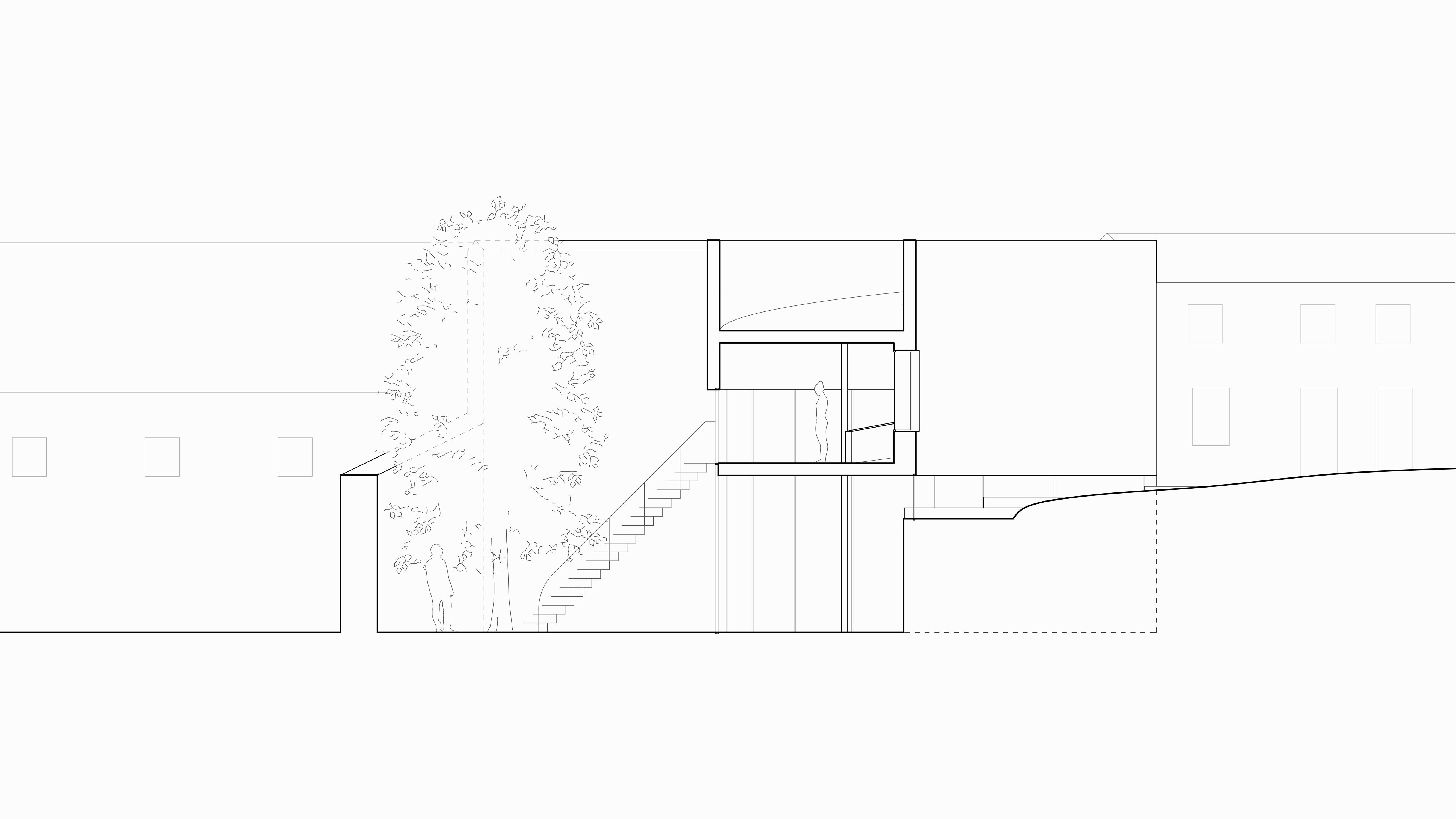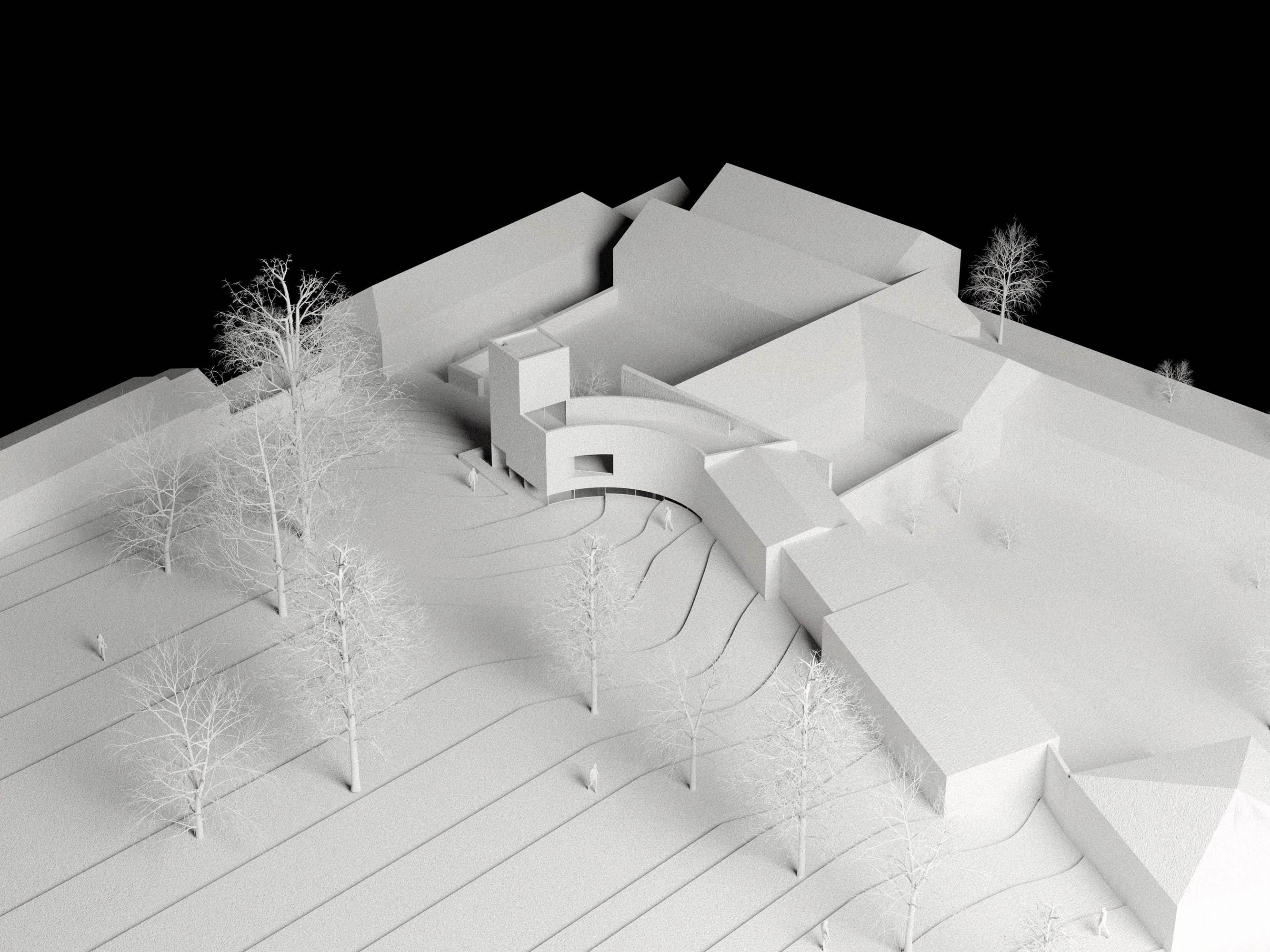 O projeto é composto por três pisos. No piso inferior encontra-se o atelier e o jardim. É neste piso onde se estabelece uma relação mais direta entre estes dois espaços, através de uma fachada em vidro. Já no lado norte, virado para o palácio, vãos mais elevados dão a ideia de transparência e leveza do volume em relação à rua.