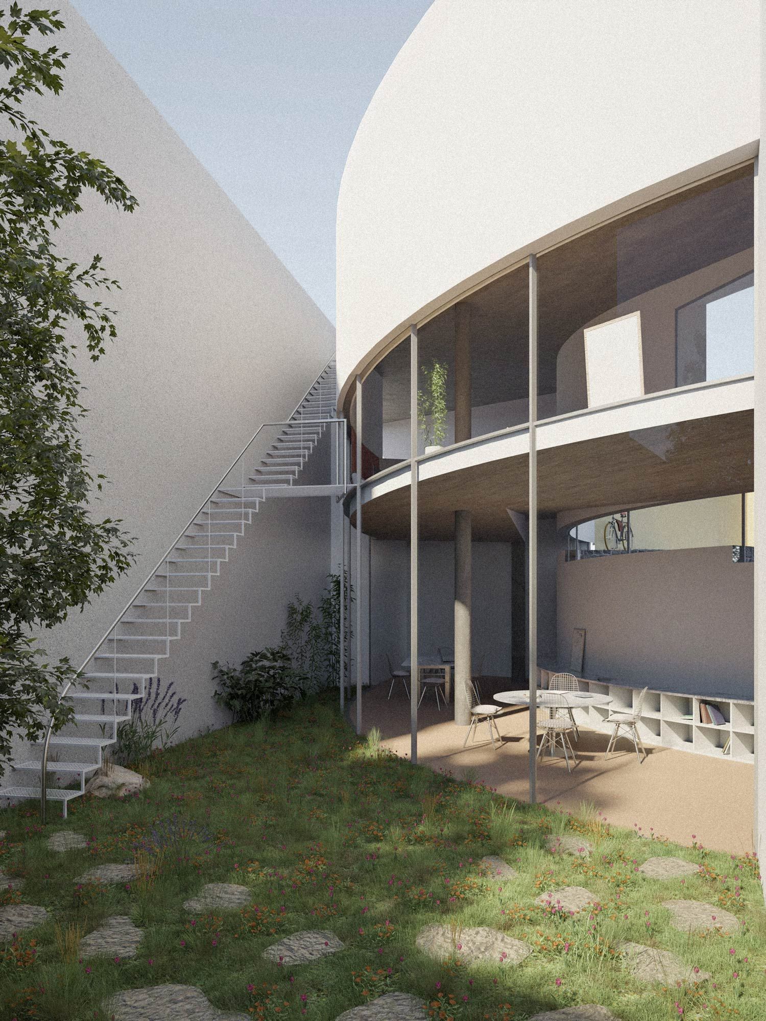 O local de intervenção localiza-se no Alto da Ajuda, Lisboa e foi proposto o desenho de uma casa atelier. Em frente ao lote, a norte, encontra-se o jardim do Palácio Nacional da Ajuda e a Sul a vista sobre o Rio Tejo. O remate do gaveto e a relação que o projeto teria com o muro existente foram duas das condicionantes que mais influenciaram a sua formalização. Através de uma curva, o projeto procura rematar o gaveto e, a partir desta, criar uma tensão entre este volume e o muro existente. A torre surge como um elemento que se destaca em relação à envolvente, pontuando assim o fim da rua.