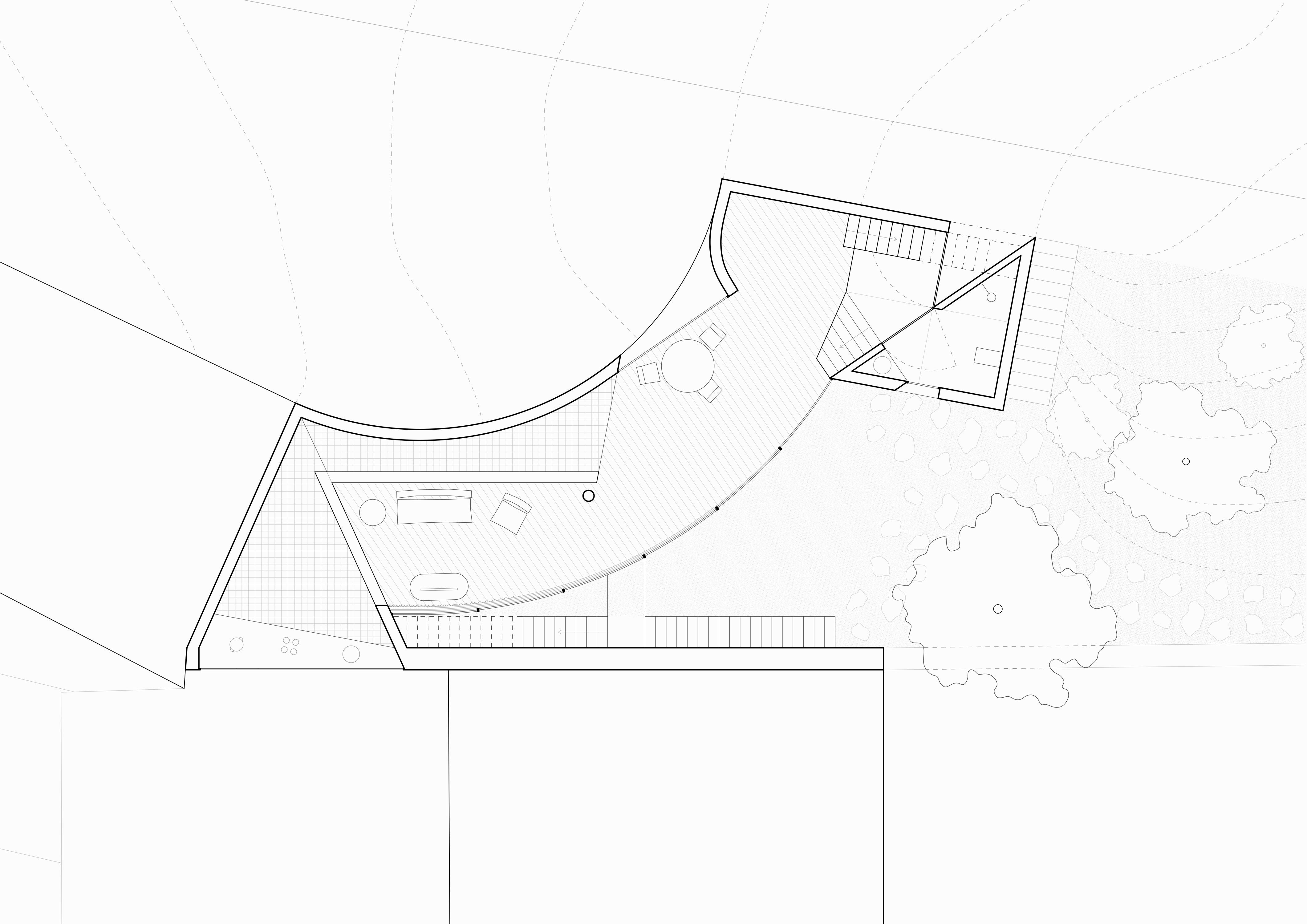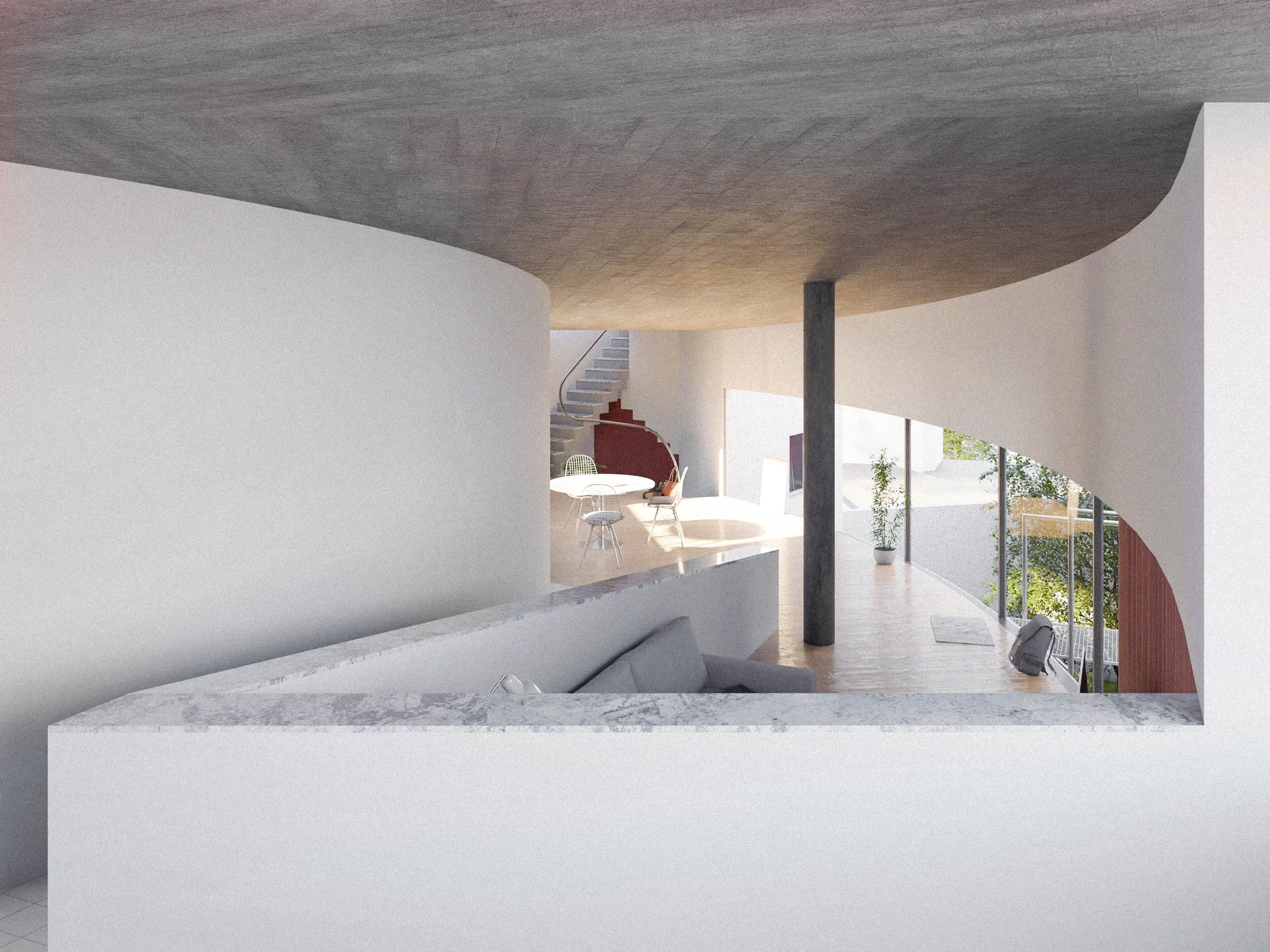O último piso, mais privado, tem um pequeno quarto que contrasta com a dimensão do terraço. Neste, um percurso inclinado culmina num espaço com a vista predominante sobre a paisagem.